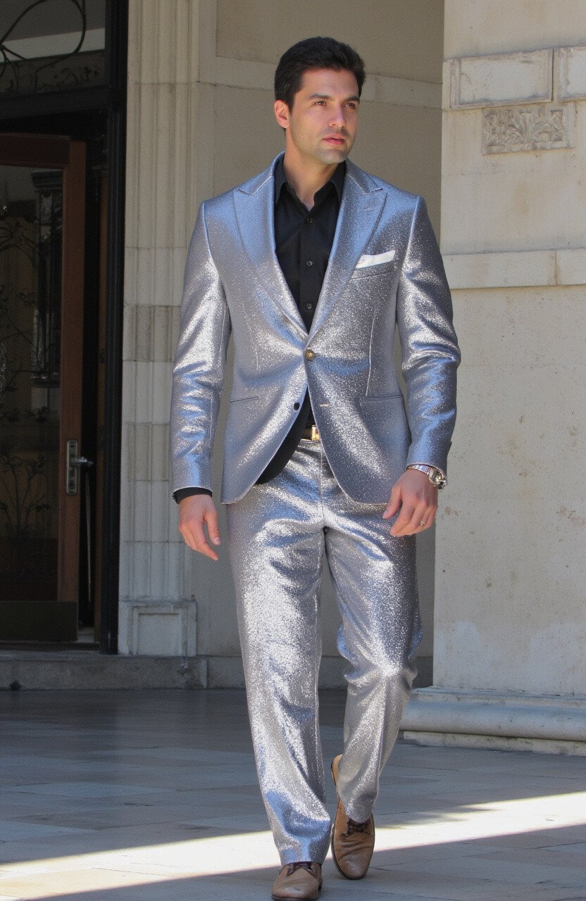 This suit is all about elegance. The silver color is like moonlight on fabric.