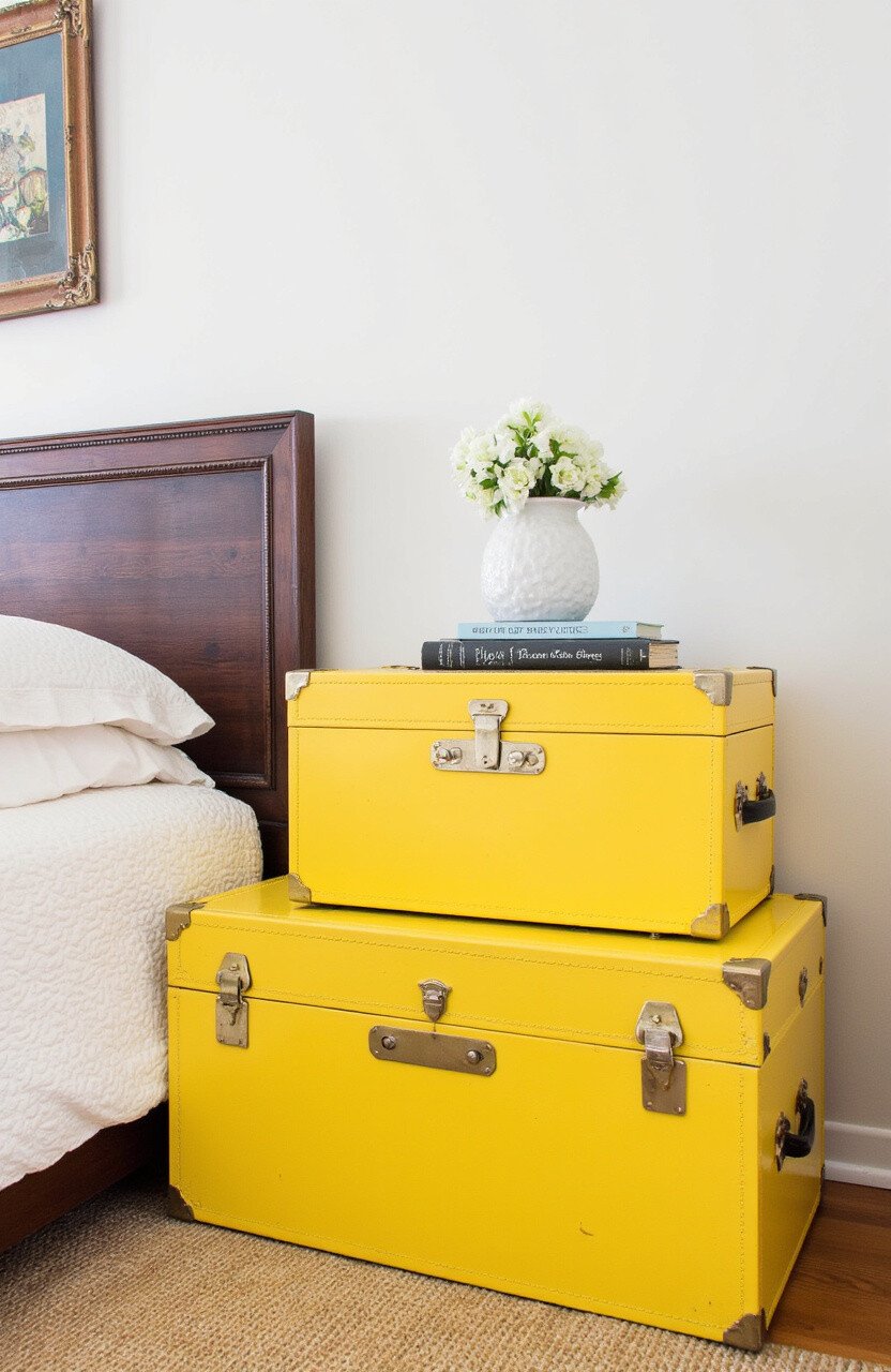 Storage meets style with vintage yellow trunks. They offer ample space and a pop of color to any room.