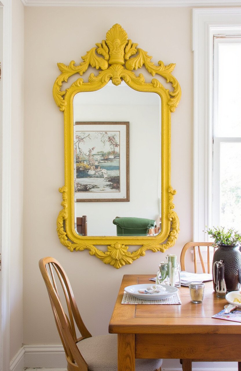 An antique mirror with a yellow frame can add depth and light to any space. It’s like adding a window without the construction.