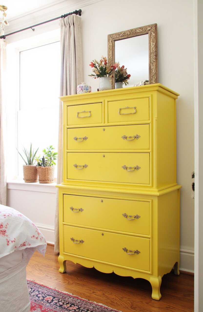 An antique yellow dresser can be the star of your bedroom. It offers storage with a splash of color and elegance.
