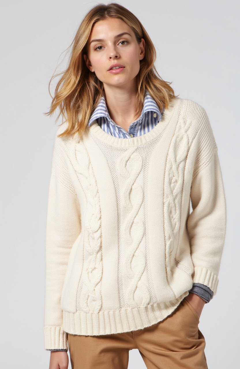 Select a sweater in a neutral color for maximum versatility. Layer with a collared shirt peeking out for added preppy charm. This outfit is a bit of an investment but worth every penny for its warmth and style.
