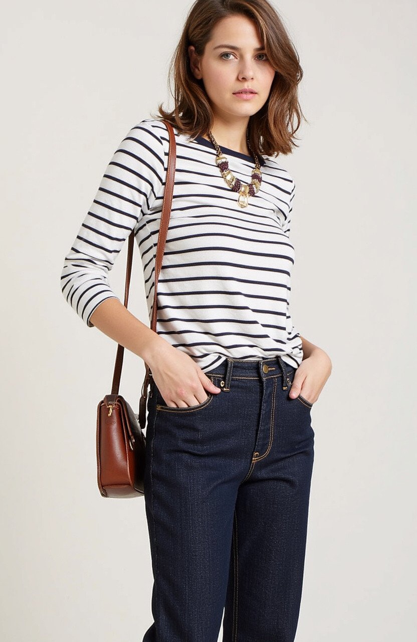 The striped Breton top is a staple in preppy fashion. When paired with dark jeans, it creates a look that’s both relaxed and stylish. The stripes add a nautical feel, perfect for a day out or a casual lunch.