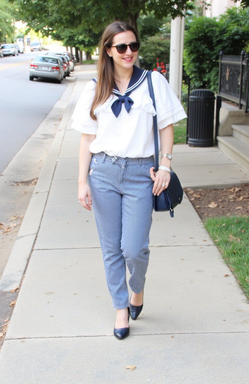 Sailor pants bring a nautical flair to preppy fashion. Paired with a ruffled blouse, it creates a chic and elegant look. This outfit is perfect for those who love a touch of drama in their wardrobe.