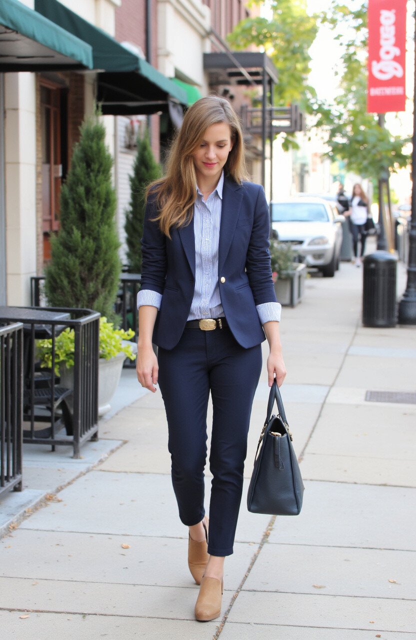 Experiment with blazers in various colors and patterns to keep things interesting. Add a statement belt to define your waist and complete the look. This outfit might cost a bit more, but the pieces are timeless staples.