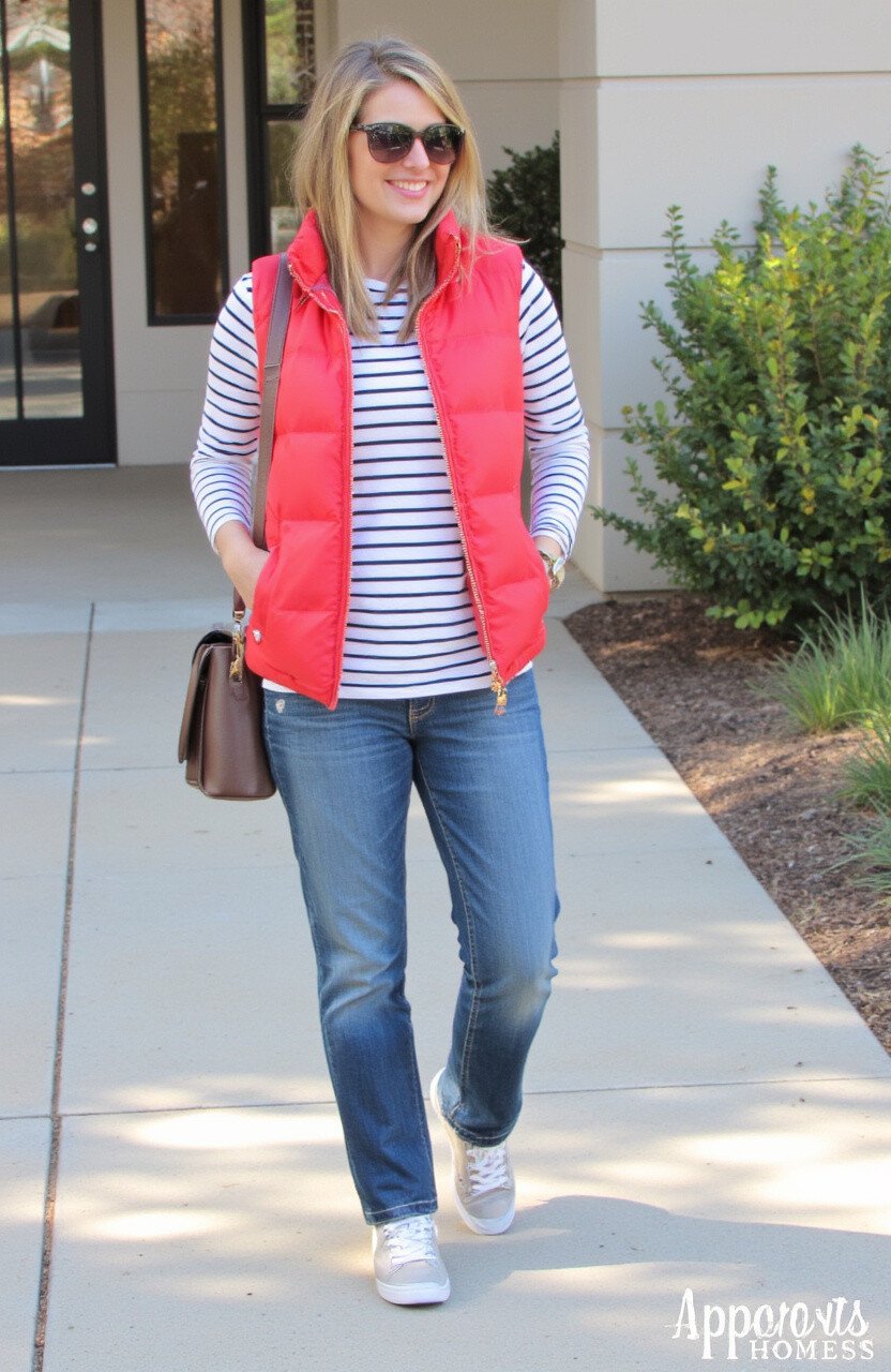 Choose a vest in a fun color to brighten up your look. Pair with jeans and sneakers for a laid-back vibe. This outfit is budget-friendly and perfect for layering.