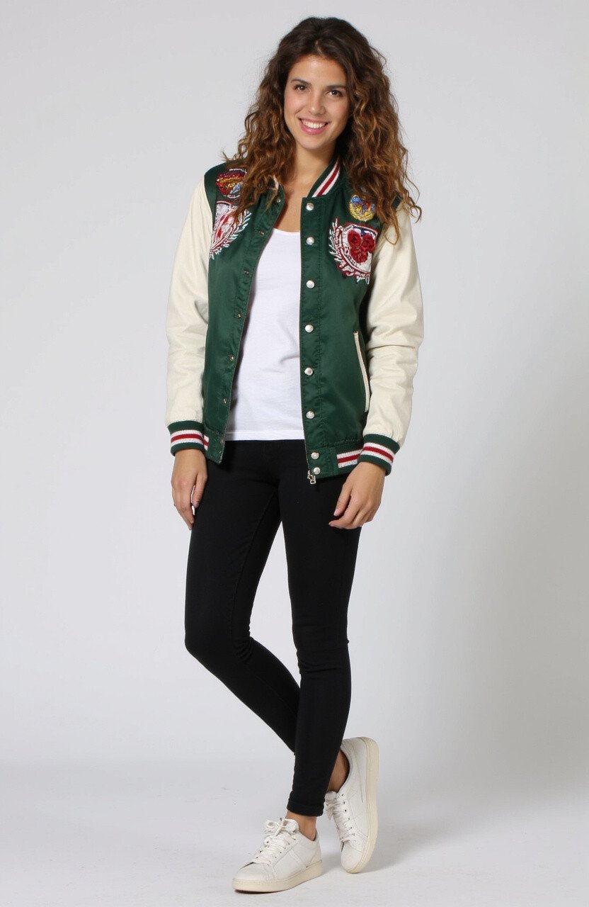 The varsity jacket brings a sporty edge to preppy fashion. Pair it with leggings for a comfortable yet stylish outfit. This look is perfect for running errands or a casual day out.