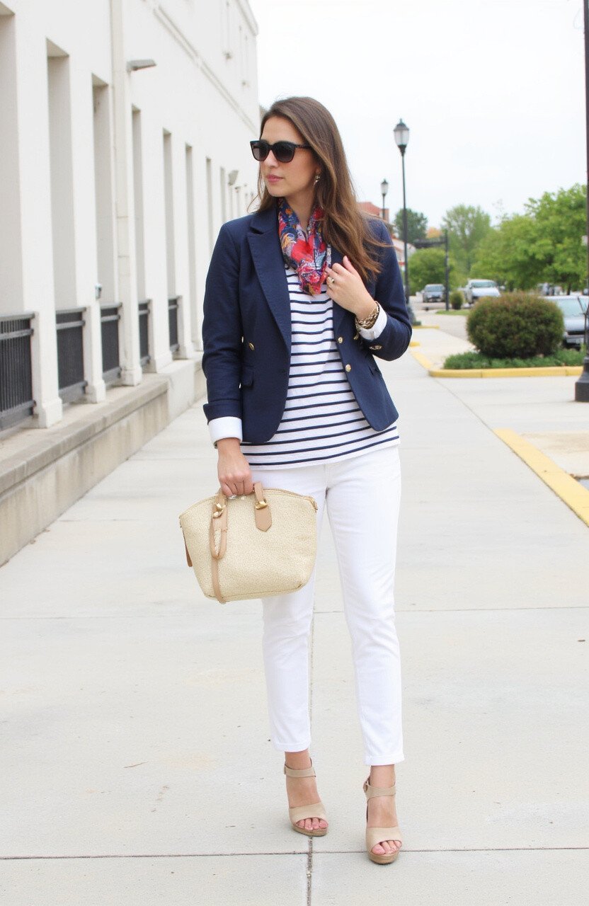 The Breton blazer is a preppy staple with a nautical twist. Paired with white pants, it creates a crisp and clean look. This outfit is ideal for spring or summer days.
